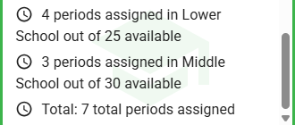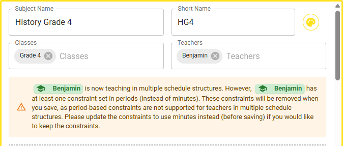 In this example, Benjamin already teacher History Grade 8 in the Middle School which runs on a different schedule structure than the Lower School which Grade 4 is part of. As such, any period constraint (ie. Benjamin's lessons must be consecutive within 2 periods) will be deleted when we save this subject.