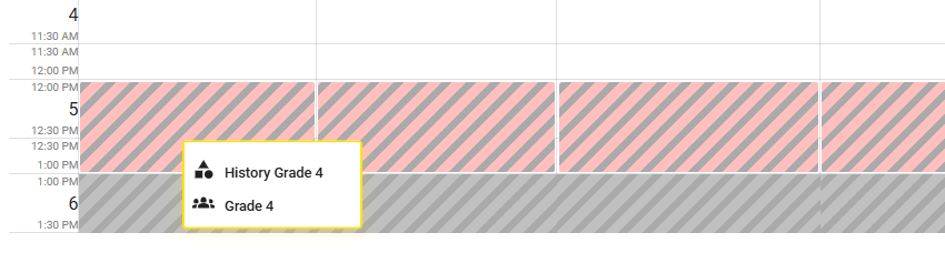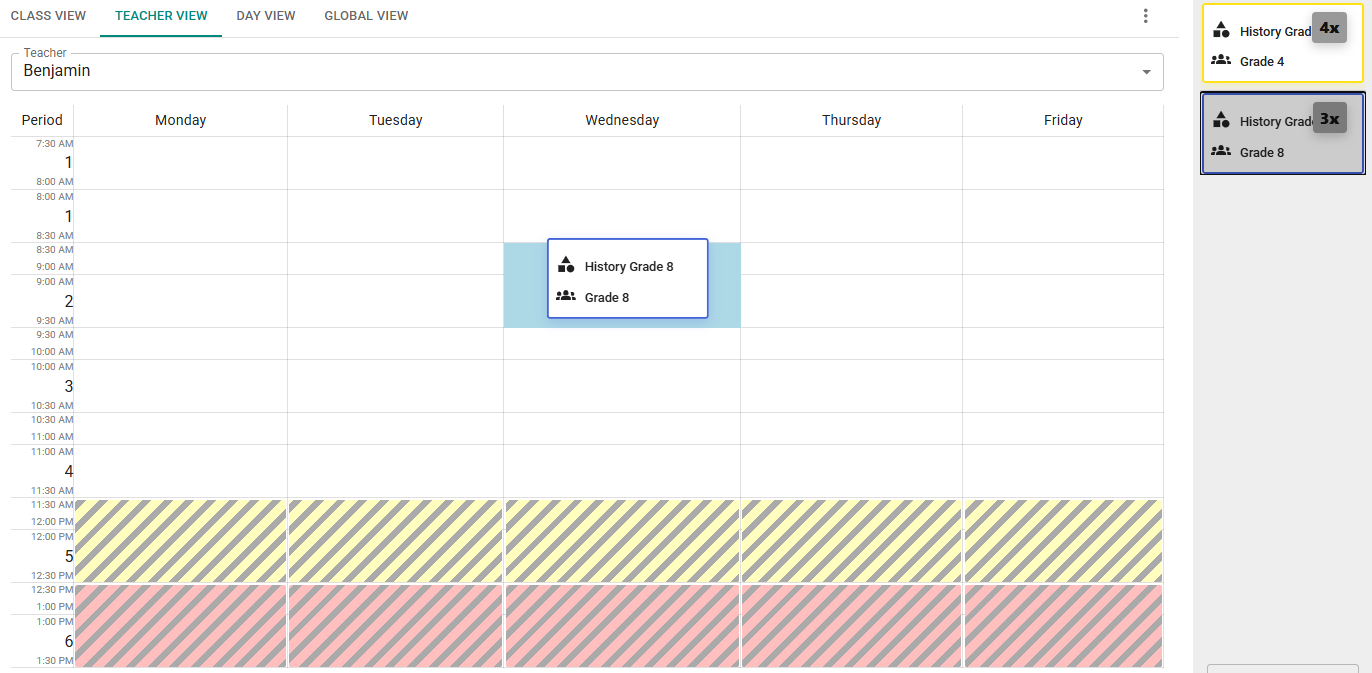 Similarly, dragging History Grade 4, which is part of the Lower School, we display the Lower School teacher calendar constraints (period 5 red). Notice also that the time 1pm-1:30pm is grey. This is because this time does not exist in the Lower School schedule.