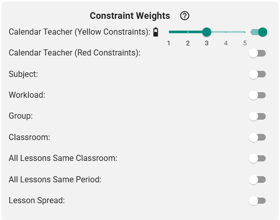 By default, all constraint weights are off. The two relevant constraint weights are the Calendar Teacher (Yellow Constraints) and Calendar Teacher (Red Constraints) Enabling either one will give you access to the weight slider on the teacher card. See the following section on the difference.